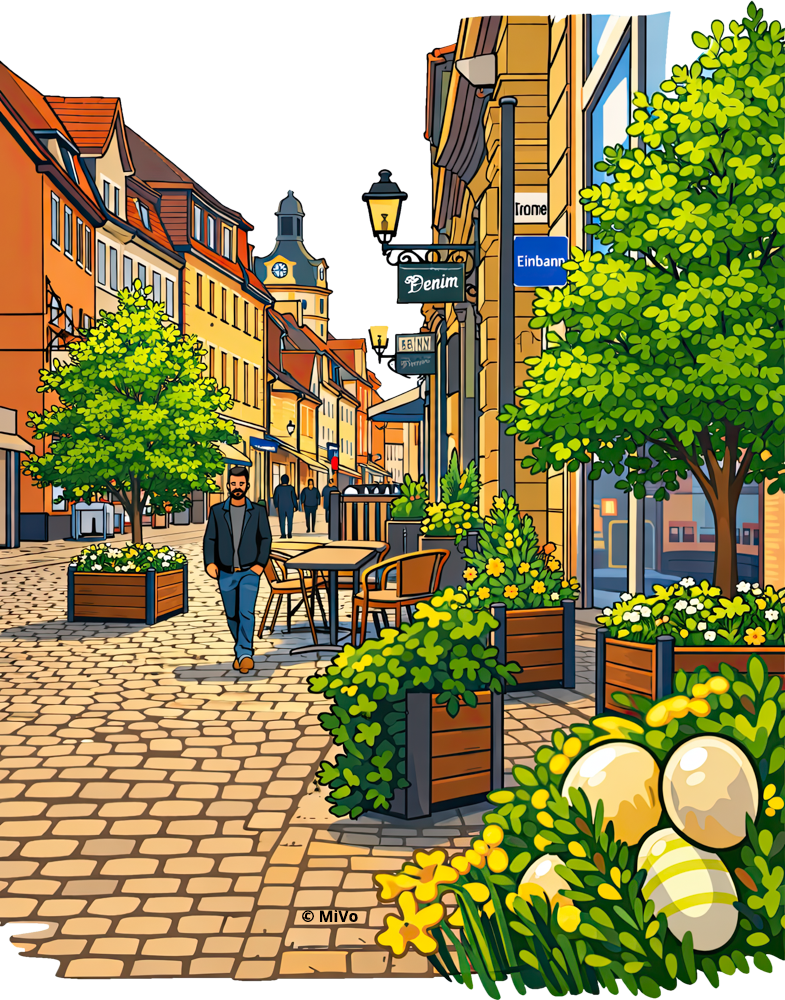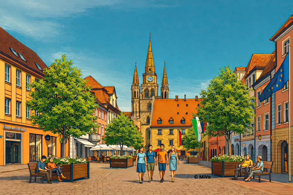 Auch die Neustadt könnte mit Pflanztrögen oder Kletterpflanzen begrünt werden und Sonnensegel ließen sich an geeigneten Stellen anbringen. Wasser hat eine nachhaltige Wirkung auf das Mikroklima z.B. am Brunnen am Fermoplatz, ein Platz mit Vorbildcharakter.